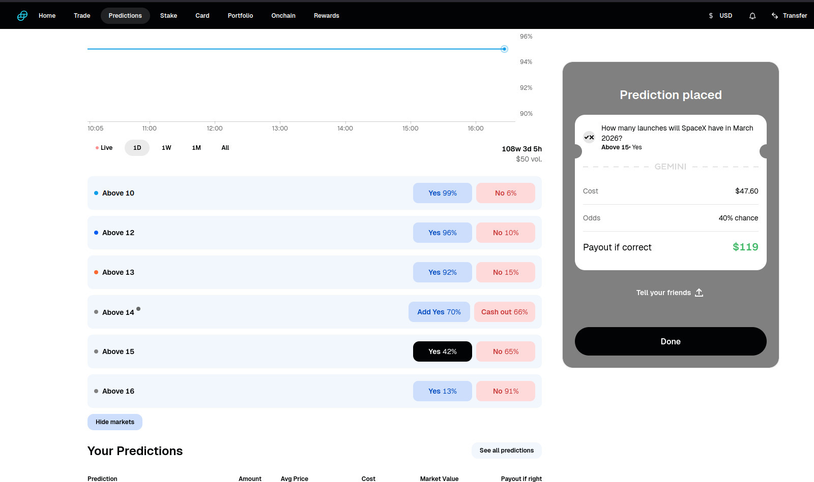 >>61917874 againThey added a bet on how many SpaceX launches there will be in March. What I find interesting is that SpaceX is on track for 20 launches, or 21 if SuperHeavy gets launched (Elon said it would, but no announcement has happened yet, and they usually have lots of lead time on them). Yet the betting only goes up to 16 launches.It's entirely possible that I just threw away $100 on these bets, if they front-loaded their launches to the beginning of the month, but if they keep up the pace then I should handily double my money.