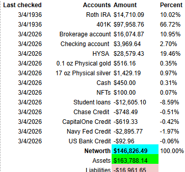 >>61935929>buy a homeI don't like my area, it's just LCOL, so idk, just paying a little under $900 for rent. Areas that I do like are too expensive. I don't think I'd live in my current area for more than 5 years. I was hoping there would be a market crash at some point. In all honesty it seems I'd outperform with just index funds long term anyway so idk.>I would be dollar cost averaging into gold and maybe other hard assets (e.g. silver or platinum)Yeah, this is what I've been doing. The IRA is a mix of GLD/SIL and the brokerage is a mix of gold, silver, copper mining stocks. Likely will just move the savings account to SGOV to make it easier.>Having 1% into something that might grow 100xany suggestions for what this could be? Or just wait for crypto in a couple years to be something again? >>61936012My HYSA APY went from 4.5% to 3.3% and even with SGOV it's 3.55%, which was around or lower than my 3.5%-4.2% in student loans, so just paid it off, fuck it.