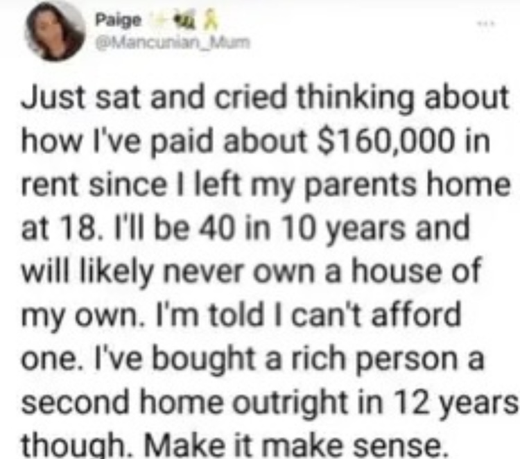 >>62105137I rent. I also rent out my own house. The rent I receive from my tenent covers my own rent and then some. Then on top of that I have the entirety of my salary. If you aren't willing to play the game then stay at the bottom of the ladder. Someone has to be down there anyway, its not a bad thing.