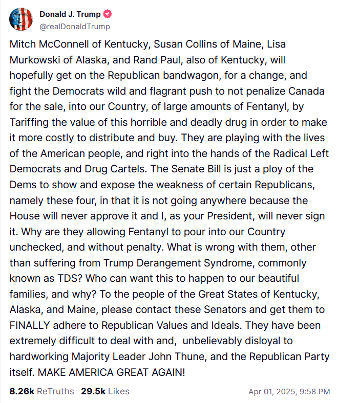 >>60103221https://www.politico.com/news/2025/04/02/senate-republicans-buck-trump-join-dems-in-rejecting-canada-tariffs-00267480Trump doesn't sign this you retard, it's a resolution. They're deciding to dissolve Trump's stupid as fuck "national emergency declaration" on Canada. Pass a fucking high school class
