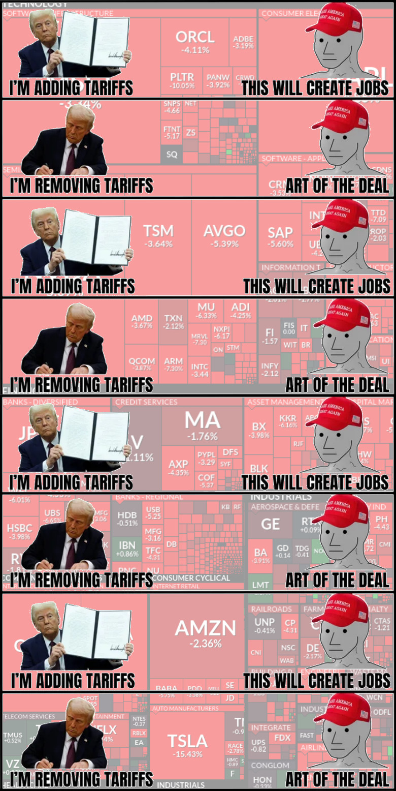 >>60103292Reciprocal tariffs were priced in for months now, because they were telegraphed for months. What we got was not reciprocal tariffs. What we got was absolute fucking insanity.