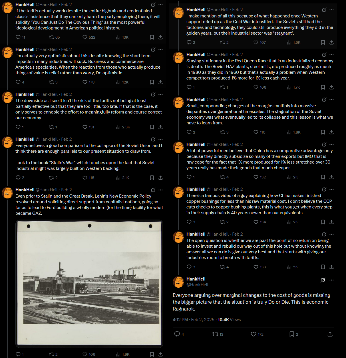 https://youtu.be/1ts5wJ6OfzA?si=z8sYJbro2k0Wk3IKGood overview of the situation - basically hee trying to use tariffs as leverage to force us out of the current neoliberal world order and into one more resembling pre-Regan while also driving manufacturing back home. America has lost so much manufacturing due to free trade that it is essentially fucked if another war happens. Remember, America thrived after WW2 because Europe's manufacturing industry was decimated. Now they have nothing and are scrambling to even the field before China pulls a fast one
