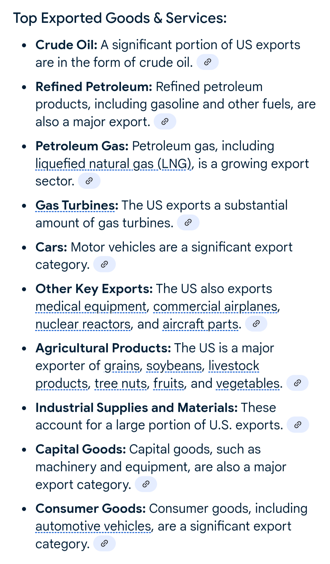 >>60134904We are going to "drill baby drill", though we export most of our crude oils already just keep it here, we'll be fine. and we already produce a shit ton of food, it's just going to be sold in America instead of exported. People keep saying we only sell services, but we are one of the biggest global exporters of many products. We import a lot of things that we also export, as a way of helping out other countries.