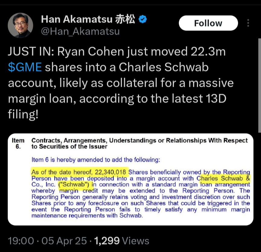 Whole economy is crashing, fast approaching 4/20, DFV is coming back with recent reddit emergence, hedgies getting margin called, next month would be requel of May 2024 pump to $80 and now RC is using his shares as collateral.