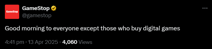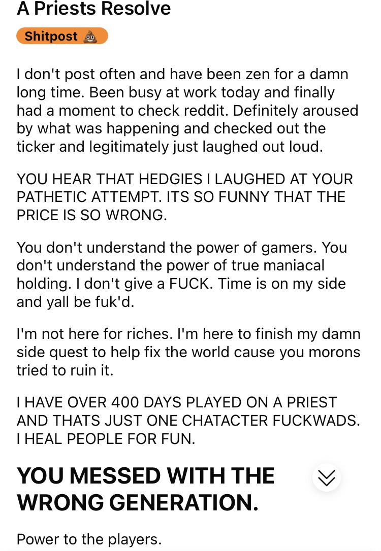 >>60258168>this general is about that company selling gamesyou're thinking of nintendo, sony, and microsoft.gamestop doesn't sell games. they sell shares.