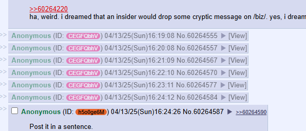 >>60265566Double checked.And here’s where it gets really wild: Why is Paris Hilton following the PP Show? Why did her brother-in-law just meet with the same Arab tycoon that RC recently met at Mar-a-Lago? Why is HBC—the same HBC connected to BBBY—also the anchor investor for Trump Media? You mean to tell me this is all coincidence? Because if you believe that, then I’ve got some “meme stock” shares to sell you at a deep discount.Every time you step back and look at the bigger picture, the web of connections only gets more intricate. The dots don’t just connect; they form a roadmap to something monumental. The institutions that thought they could play the same games they’ve always played, manipulating stocks, gutting companies, and suppressing retail investors, are scrambling. The level of obfuscation, misdirection, and outright censorship around this entire saga suggests that the people in control are losing control.So, where does this all lead? What happens next? That’s the trillion-dollar question. But one thing is certain: Retail investors aren’t stupid. They’ve done the homework. They’ve connected the dots. And when this all finally unfolds, there are going to be a lot of very surprised people wondering how they missed the biggest financial story of the decade.Buckle up.