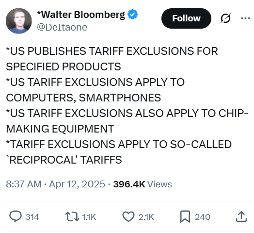 Smartphone and cumputers are now suddenly tariff exempted. What a pathetic little cuck. Now you understand how his entourage bought yesterday as they already knew.Now, what is the implication of USA losing the tariff wars, as that's exactly what is happening, and folding to China over a mere 0.5% higher bonds yield.How the mighty has fallen, holy shit.