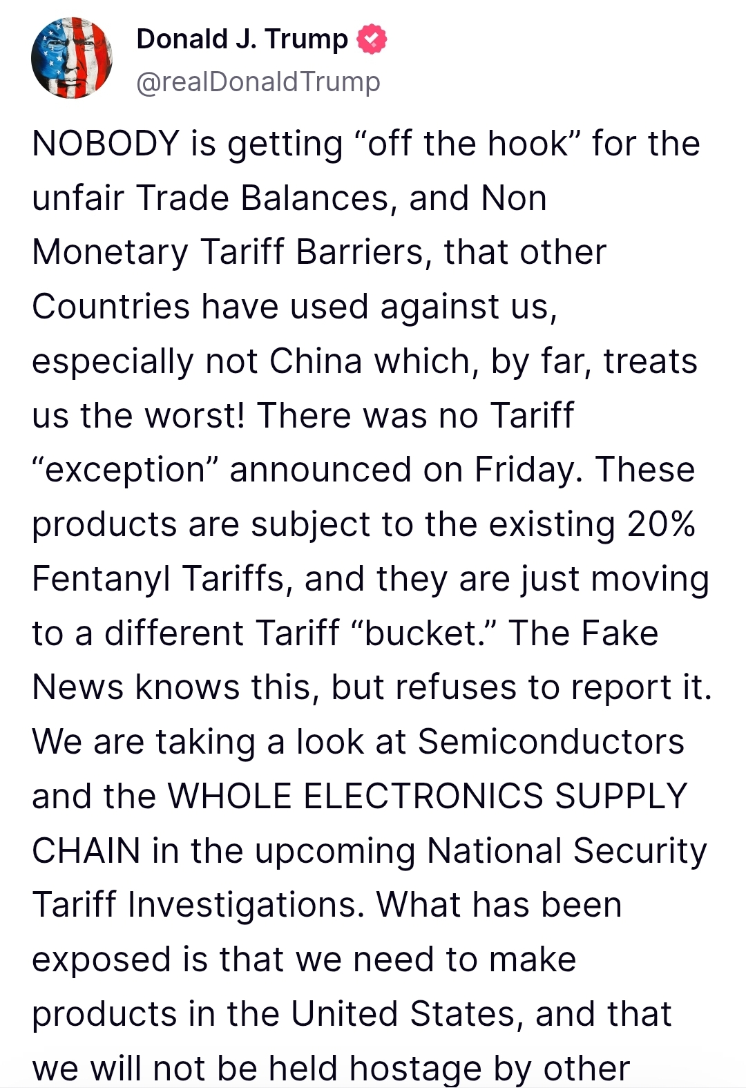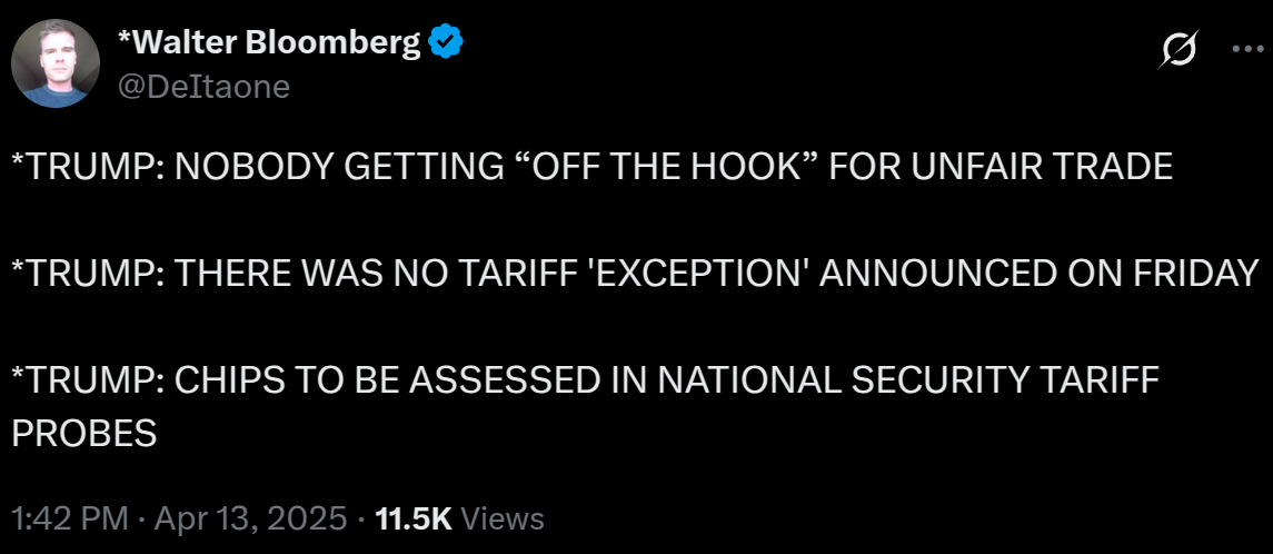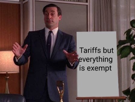 Can you guys explain to me like im your retarded stepson what this means. do this mean all the green pumpenings we might have seen due to the tariff exemptions on some semi / tech devices are going to be all gone now and we're going to get red dumpenings?
