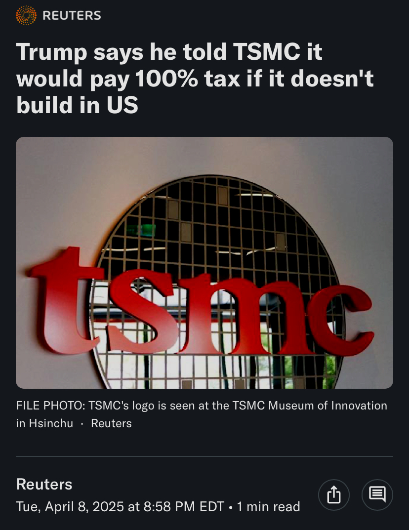 Does he know you can't just move chip fabs? Did Elon not tell him? TSMC's fabrication process is precise to the nanometer and they literally have THE most sterile environment on Earth save for artificial vacuums. How does he not know?