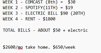 $3300 a month - taxes (I overpay) + 5% ROTH = $2400Rent - $1275Golf membership - $74Internet - $50Water/electricity - $180Patreon - $5Gas - $80Food - $200Broker - $200