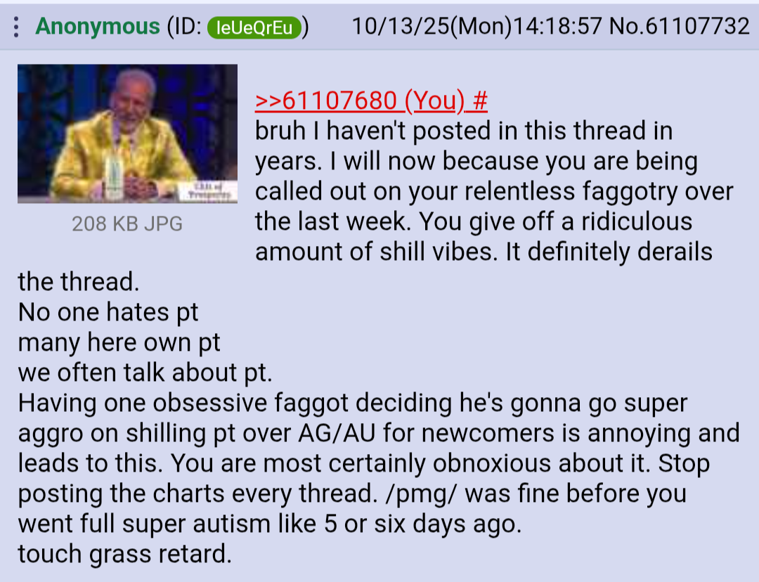 >>61108142for what purpose? Within 20min it will be overrun with fud bots and seething maxipads. I believe any serious polfag already own some/is aware about PMs, only newfags might be clueless. Too bad for them i guess.