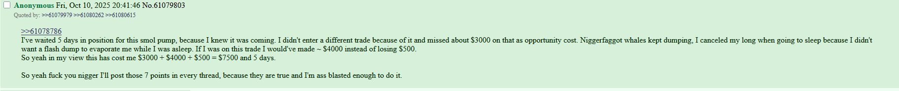 >ho nooooo i lost 500$ leveraging ltc because i'm a fucking retard and could have made 3k if i didn't panic like a bitch. let's now shitpost in any biz thread and fud ltc