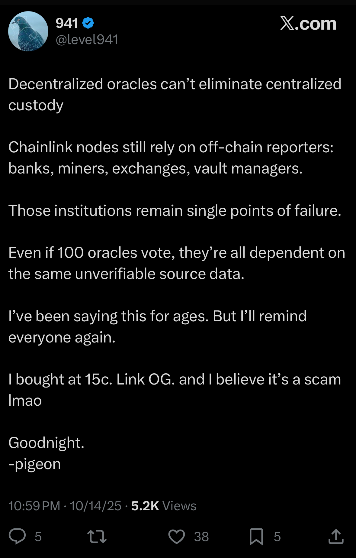 >>61122209Claim 1:>Chainlink nodes rely on off-chain reporters like banks, miners, exchanges, vault managers.Chainlink’s design aggregates data from multiple, independent sources, including exchanges, institutional APIs and even other on-chain feeds. A single exchange going offline or being compromised doesn’t break the oracle feed.Claim 2: >Those institutions remain single points of failureIn Chainlinks DON, each node operator sources from multiple APIs and undergoes reputation tracking and staking (with Chainlink Staking v0.2). The aggregation contract filters out outliers and manipulations. Thats the whole purpose of decentralization, to eliminate single points of failure at the data layer.Claim 3: >Even if 100 oracles vote, they’re all dependent on the same unverifiable source data.This assumes all nodes pull from identical sources, which is false. Chainlink feeds intentionally use heterogeneous data sources, not just exchanges, but also institutional grade price aggregators, liquidity venues and proprietary data providers. On top of that, cross-verification between feeds and on-chain proof of reserves allow the data to be cryptographically verified, not just “trusted.”