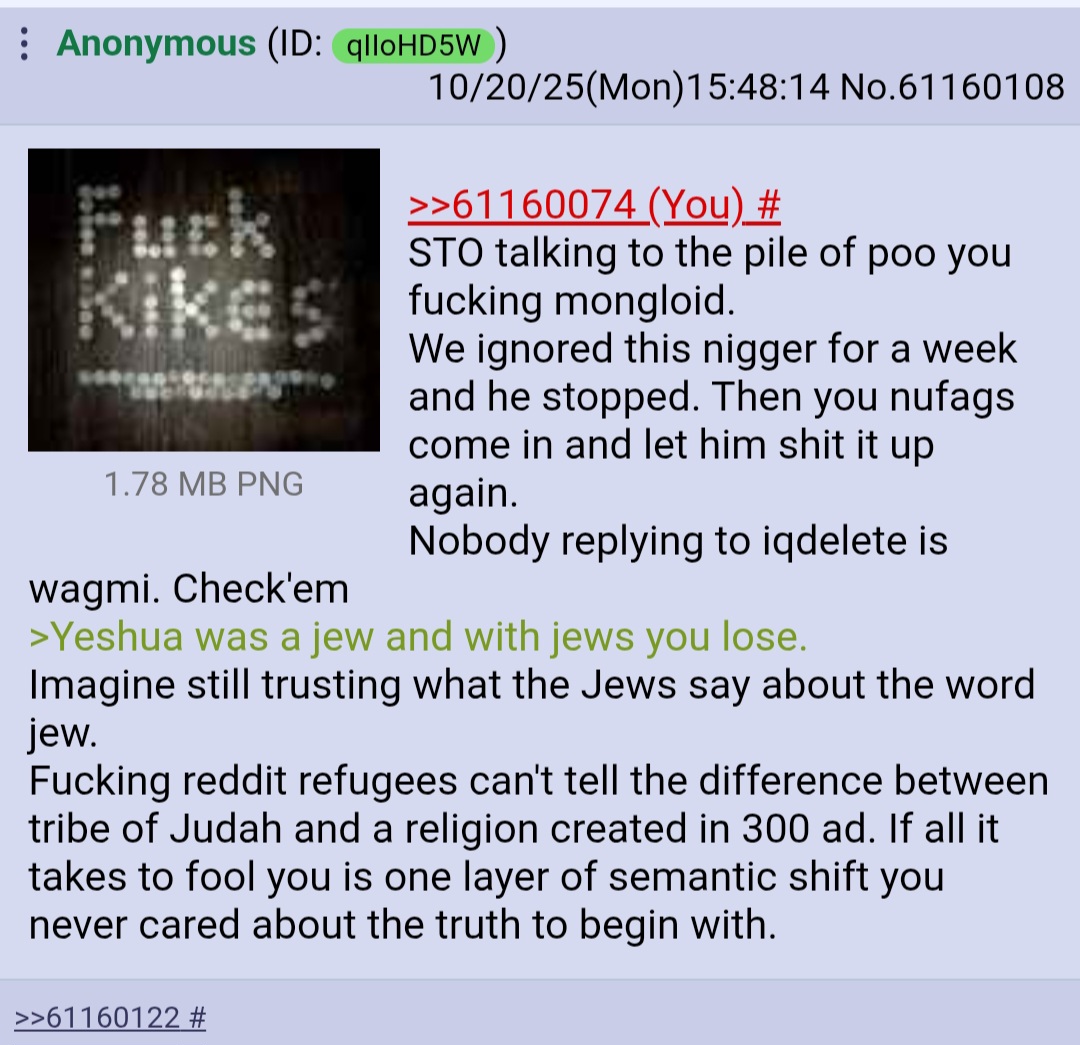 >>61160074STO talking to the pile of poo you fucking mongloid. We ignored this nigger for a week and he stopped. Then you nufags come in and let him shit it up again. Nobody replying to iqdelete is wagmi. Check'em>Yeshua was a jew and with jews you lose.Imagine still trusting what the Jews say about the word jew. Fucking reddit refugees can't tell the difference between tribe of Judah and a religion created in 300 ad. If all it takes to fool you is one layer of semantic shift you never cared about the truth to begin with.