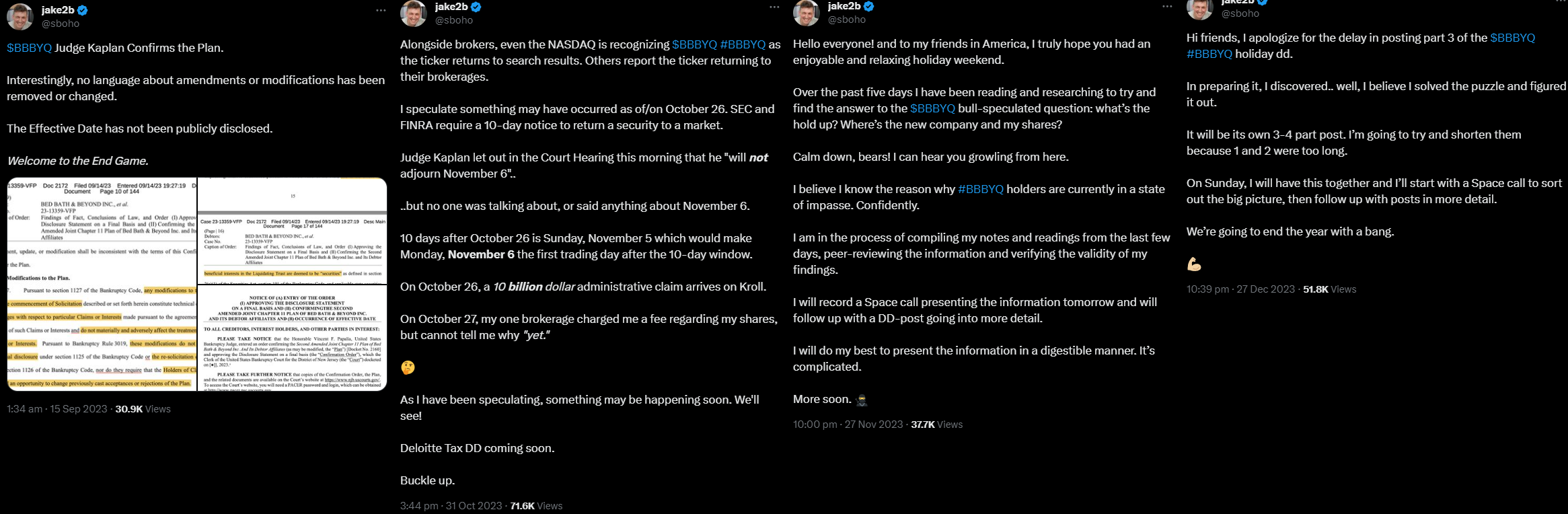 https://open.spotify.com/show/64hmkmXpetPEVGPlExkDGl>ex-board member Holly Etlin makes claim that what happened to Bed Bath & Beyond has not happened except in cases of fraudhttps://www.reddit.com/r/Teddy/comments/1945r00/holly_etlins_statement_regarding_bbby_potentially/>Share Buyback Fraud Explainedhttps://threadreaderapp.com/thread/1749490369258250493.html>Do companies state that they face bankruptcy...but then *suddenly* do a 180 "Reverse Uno", squeeze short sellers and bring riches to shareholders?https://reddit.com/r/BBBY/comments/16ohoy3/do_companies_sometimes_officially_state_that_they/>How Can BBBYQ Exit Chapter 11 In A Way That Benefits Shareholdershttps://reddit.com/r/BBBY/comments/15r9jgh/guess_whos_back_salvatores_back/>End Game: DTC and NSCC are screwed as the DTC just proved shareholders should Directly Register Shares (DRS)https://reddit.com/r/Superstonk/comments/13a3yh1/end_game_dtc_and_nscc_are_screwed_as_the_dtc_just/bbby "class action" case against RCCASE NUMBER: 1:22-cv-02541-TNMhttps://www.courtlistener.com/docket/64916203/si-v-bed-bath-beyond-corporation/Ryan Cohen's 16b short swing rule was dismissed the other day. But his "pump and dump" case is still active and may be holding things up.Bad actors are attempting to delay the chapter 11 proceedings for as long as possible, stay comfy and expect delays, nothing is finalized until the chapter 11 has fully concluded.Larry Cheng, who is a current board member of GameStop went onto theppshow podcast 8 months after bankruptcy, and 2 months after shares were put on ice.previous thread:>>61059267