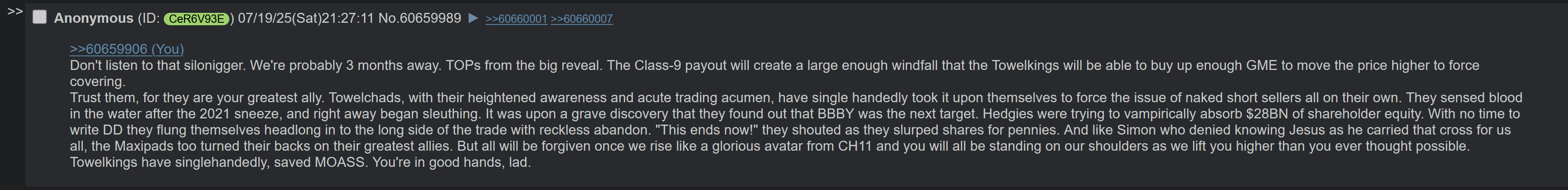 >>61182667I think what Frieren poster is saying is that nothing explosive happens with gme until m&a activity takes place involving tzero.>They aggressively target the gme thread (without posting much at all in this thread) in order to get gme holders to make dumb decisions. They say gme won't move until the chapter 11 is concluded in order to stop people from buying gme at lows.Wouldn't that cause the exact opposite though? If people begin to realize and agree that nothing truly spicy happens until m&a activity takes place, then now is the time to accumulate because these ARE the low prices?>>61161634oh i understand what your here for now. satire poster.