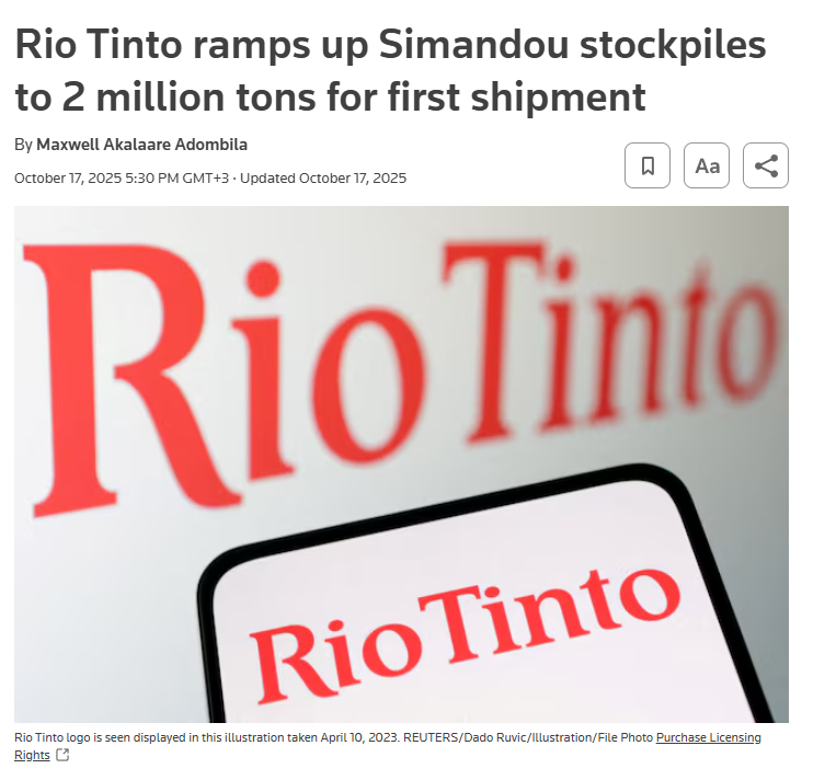 The largest untapped high-grade iron ore deposit is about to ship its first cargo next month.Originally awarded to Rio Tinto in 1997, Israelis bribed the government of Guinea to grab half the blocks, which eventually went through multiple court cases with the involvement of the CIA and George Soros among others, before eventually falling into Chinese hands.Now Rio Tinto only controls 40% of half the project, so about 20% overall. The rest is controlled by China and the Guinean military junta.It is going to drastically change the global iron ore market and commodity prices.Iron ore the most traded commodity in the world by volume, and feeds into steelmaking, the backbone of the entire global economy.