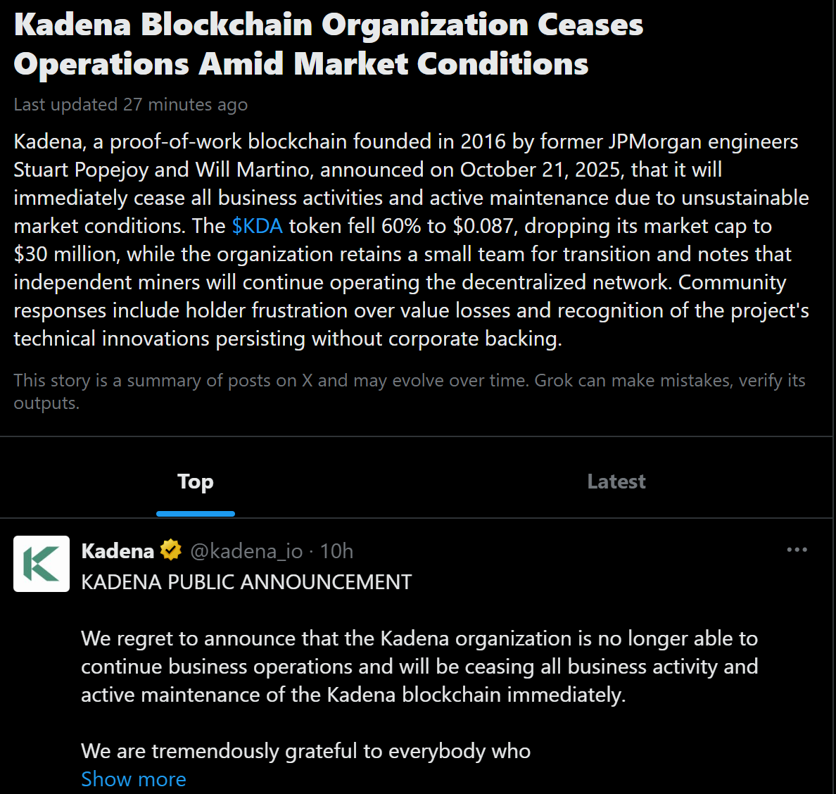 >>61170600>>61170689https://x.com/kadena_io/status/1980720876371779761wtfis this the first time this has happened? this was a 75million mcap coin last week