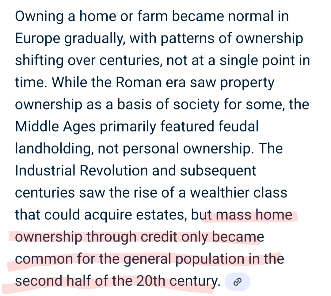 >>61179545Where does this idea that home ownership was ever normal for wagies? The closest we've come to that is following the black plague when any poorass could just happen upon a well kept recently emptied farmstead and claim it. The current demographic collapse of the west should provide the same benefits as the population collapses of the past, but we're giving Ranjeet and Pritya a better life instead.