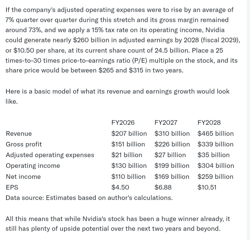 >>61180855>There is no consensus on Nvidia's 2030 stock price, with predictions varying widely. Some analysts forecast prices in the range of $370 to $965, while more bullish estimates suggest a target between $1,300 and $3,115 or even higher, especially if the company's projected revenue growth in AI infrastructure is realized