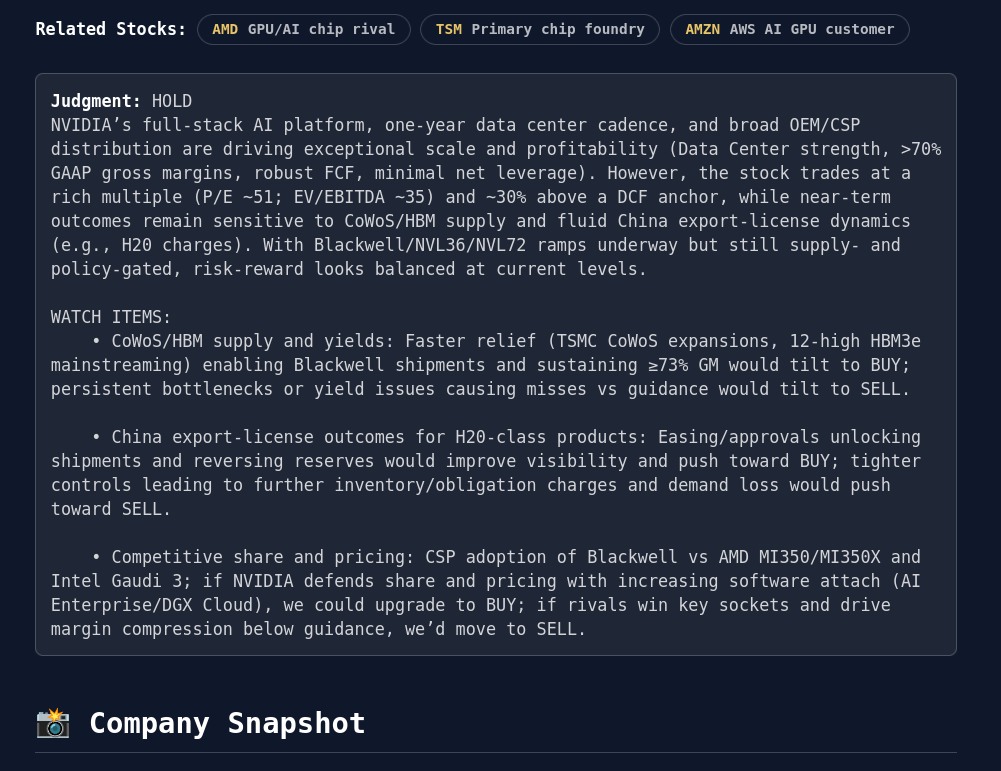 >>61180834The company fucking made 54 billion in one quarterNVIDIA (NVDA) is highly profitable, with strong revenue and profit growth driven by AI demand. In the second quarter of fiscal 2026, revenues grew 56% and non-GAAP earnings per share increased 54% year-over-year, with a non-GAAP gross margin of 61%. Analysts project continued strong performance, with the company forecasting third quarter revenue to increase 55% to $54 billion, and gross margins to be around 73.5%.