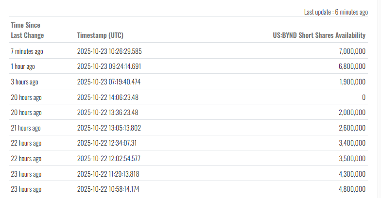 not sure how to interpret this but short availability increasing is bad for a short squeeze, right?The short fee APR also decreased massively from 500% to 20% today.https://fintel.io/ss/us/bynd