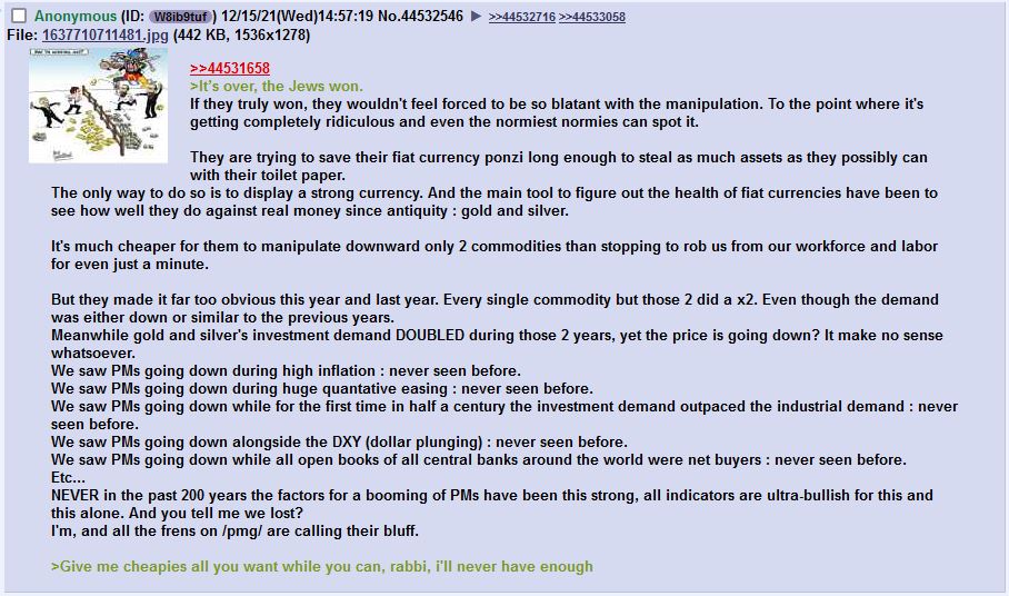 >>61187002>we need everyone else to think it's going into the thousandsProblem is retail have literally zero impact on the price, they (and we) simply are following (((market makers))) like sheeps, and they are deciding how much it should be at any given minute. A commodity can't "naturally" drop 10% in few hours on zero news just like it did, all while demand is through the roof. It's 100% artificial.You probably already know this, but that's why we stack physical only here, to take away from them the ability to manipulate the prices with futures as they wish. And the dam is already breaking, that's why futures and spot are decoupling.