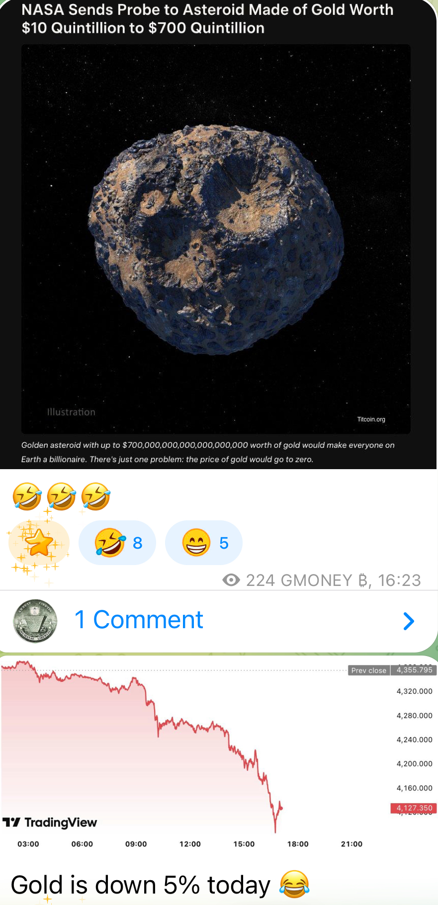 >>61189712>there's just one problem: the price of gold would go to zero>there's just one problem: a probe can't actually mine any resources>there's just one problem: we don't have any methods of harvesting or hauling $700 quintillion of Gold>there's just one problem: we don't have any space construction businesses>there's just one problem, nobody wants to actually spend their real gold to prospect for fantasy space gold>there's just one problem: it's a CGI image and you just have to trust us. this meteorite totally exists and it will 100% be harvested and ruin your wealth in your lifetime