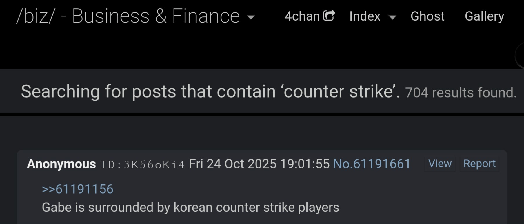 >>61195682fuck off newfaggot cunthttps://warosu.org/biz/?task=search&ghost=false&search_text=csgo