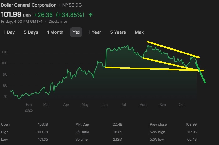 For the apocalyptic SNAP benefits shutdown I really like DG. They are up but the last few months have seen investor ambivalence. This mood is ripe for a major souring if tides turn against it. In pic related you see a major bearish descending pattern. With the green line shows that if it breaks it can see 90 a share extremely fast but 80 is very easily possible.15% of this companies sales are from SNAP benefits so 15% instant haircut seems right. We lose SNAP benefits on November 1st so its not that bad to hold two week out puts.>>61200814BBBY still exists as CDNS? what the heck?Potential upsets I see are Enphase because it is no way they haven't gotten their company back into gear with data centers, this stock has taken a incredible beating but chilled out for 2 months its in a great recovery position.otherwise this week is your usual Tech Week not sure either way. Maybe RKT beats huge actually, just noticed that.Holy shit my OPEN asshole will rip HUUUGE if RKT beats.