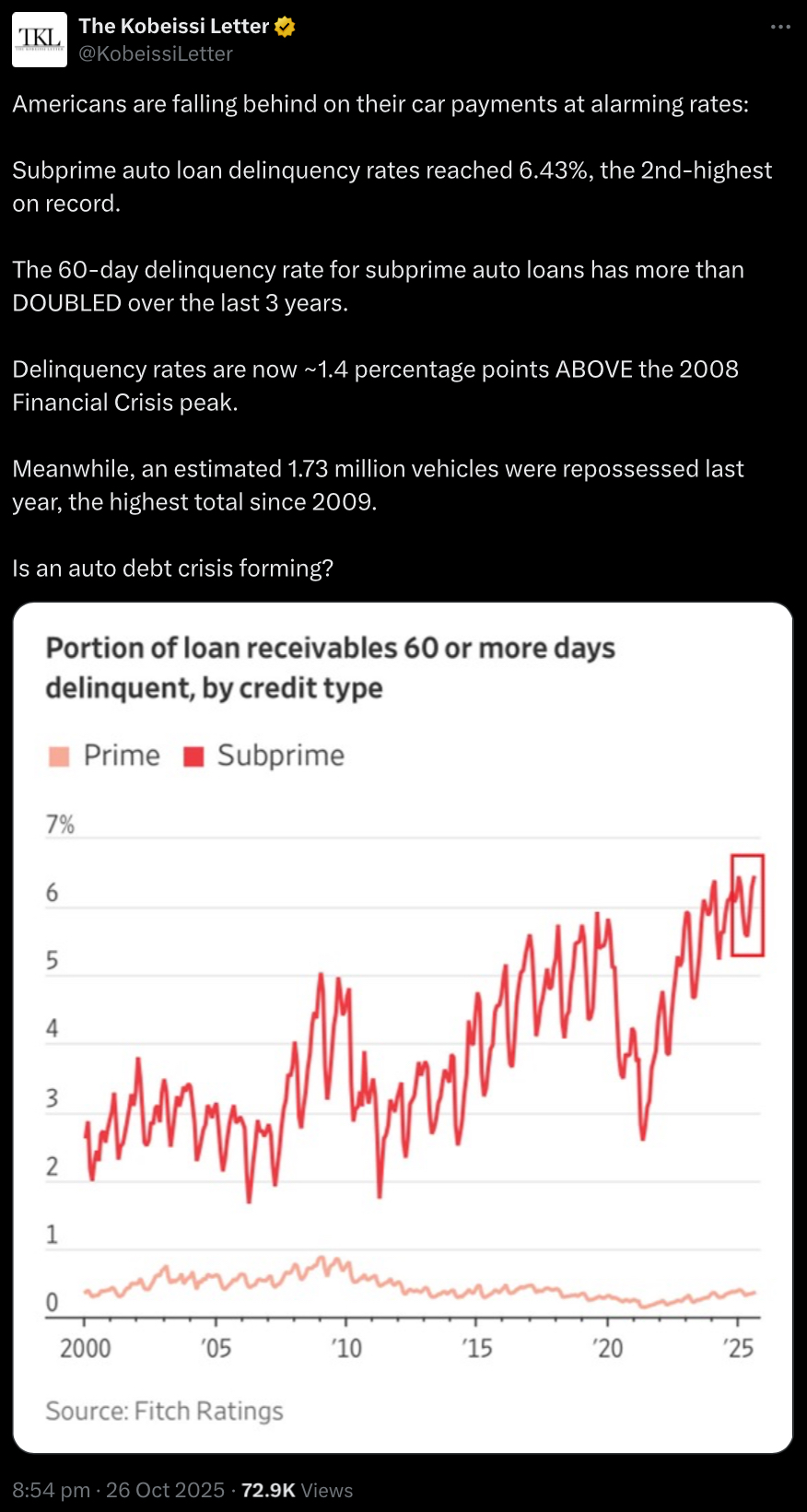 >>61202317Can I get a qrd on this?Aren’t autoloan delinquencies fundamentally different from housing mortgages since they’re fairly easy to repossess and resell.