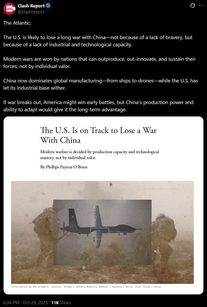 >>61220741WWII was different in that many nations largely supplied themselves and didn't have global capital that could outbid anything domestic. But US does need to get some manufacturing online the Chinese are already using their manufacturing against the US for trade advantage because they're using state power to shield their industry they have spent a long time positioning to be the global sole provider. This won't last long the way things are going, but for now it works. DC Democrats largely created this mess which is one of the reasons why they're doing so poorly right now.