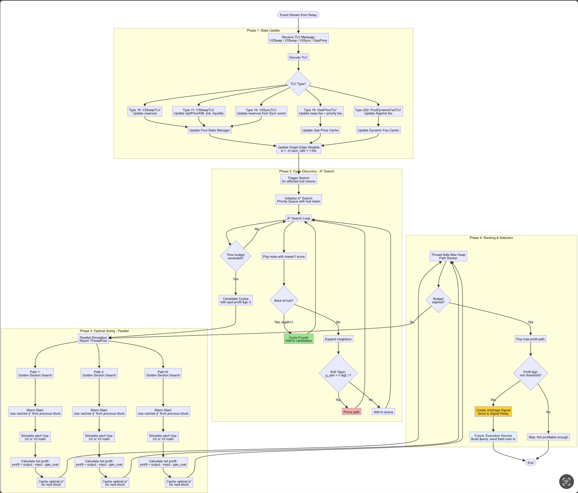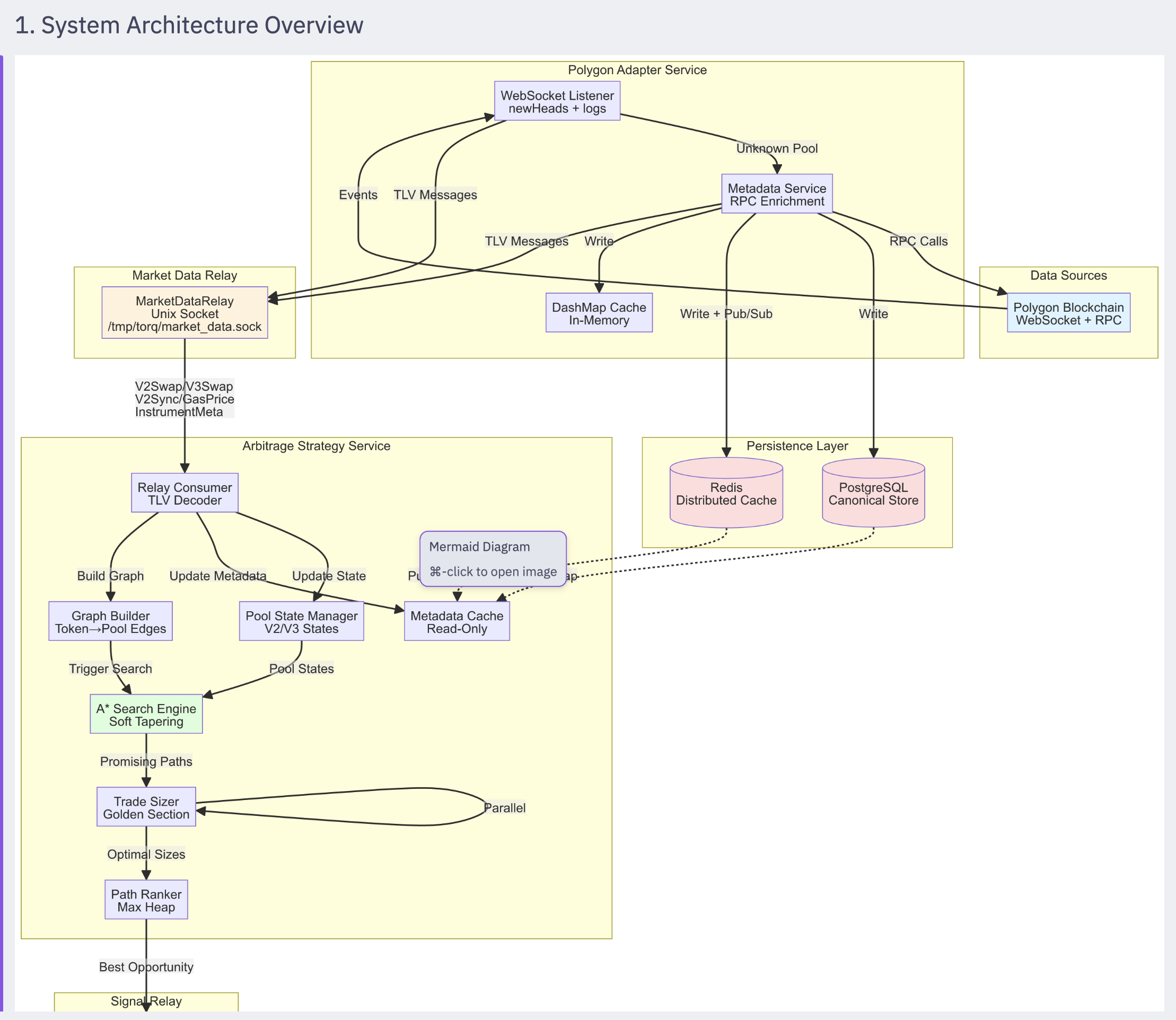 >>61228709Thanks I'll add that next time>>61228748They're generated from Mermaid code blocks, but rendered on the fly in the separate pane, yeah. On my latest refactor/rewrite, I'm hoping to have some dynamic diagram generation depending on how the system is configured though. So for a defi arb profile, it'd give me a composite diagram of the different services / modules being used. I only see that being sustainable / maintainable if it's dynamically generated. But it'd be helpful for me so I could get assurance on how things are wired up and which code paths are executing.