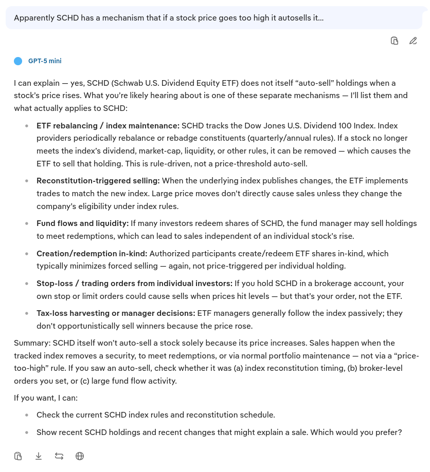 >Apparently SCHD has a mechanism that if a stock price goes too high it autosells it…