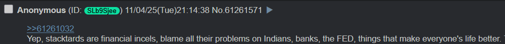 >>61261032Yep, stacktards are financial incels, blame all their problems on Indians, banks, the FED, things that make everyone's life better. They expect everything the boomers had after a lifetime of work when their only skill is schizo rantings on anime blogs. Once they take responsibility for their own investments life will get better