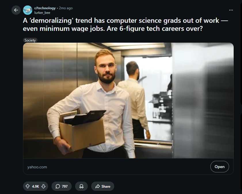 >>61273929>SoonLol, lmao even.Google search for CS degreeAutocomplete:CS degree useless (top)CS degree no job (2nd result)That's my situation right now as a recent grad. The situation is already fucked but only tangible if you're in tech, especially if you're a recent grad or a student and haven't landed a job yet. CS/IT positions get fucked the hardest because computers are easiest shit to automate, but soon it'll spread to other fields as well.