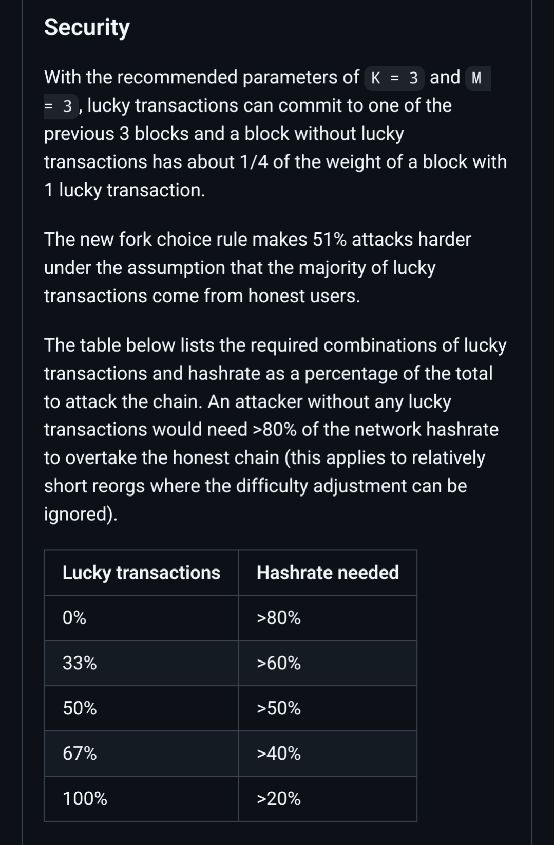 >>61305989https://github.com/monero-project/research-lab/issues/145TLDR: an attacker would need to have 51% more hashpower and 51% more lucky transactions than the honest chain to 51% attack.