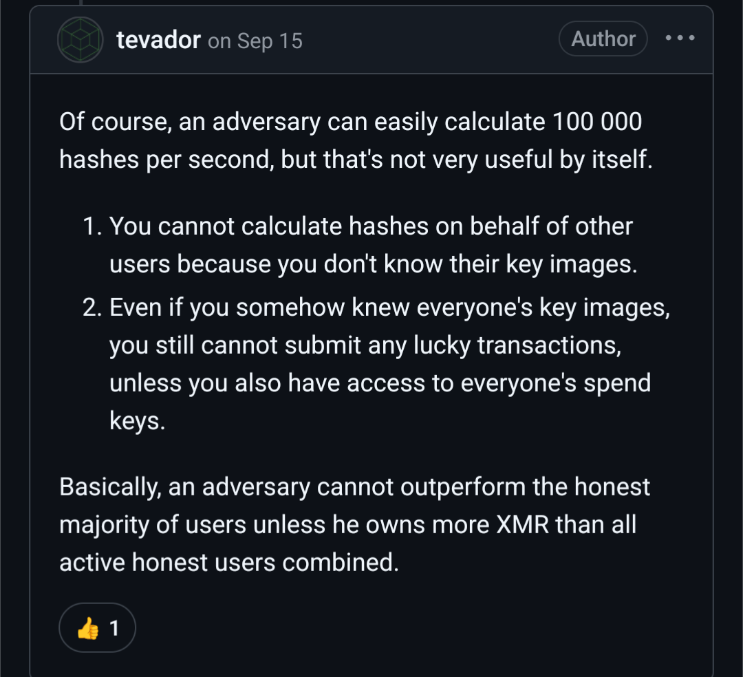 >>61315437Understood, but two questions:1) Wouldn't liquidity providers and coin swappers be able to get that amount of XMR quite easily? What about darknet markets? Have all those moved away from custodial wallets or do they keep XMR for escrow that they could use for a 51%?2) If accumulating 338k XMR is harder than accumulating 51% of the hashing power, wouldn't a system based ONLY on lucky transactions be better than any mixed system where the hashing power is basically discounting the impact of lucky transactions?If I understand correctly: it's not that you'll need BOTH 51% hash and 51% lucky transactions, it's going to be a mixture where if you have say 90% of the hash then you need almost no lucky transactions to do the re-org and conversely if you have 90% of the lucky transactions you need almost no hashing power. I don't know if the mixture is linear or if there's a way to weight some power of each so that you need a more balanced mix to win... Or am I wrong and perhaps the best chain is the one which has the best min(hashpower,luckytxs)? I should go read the spec in more detail.