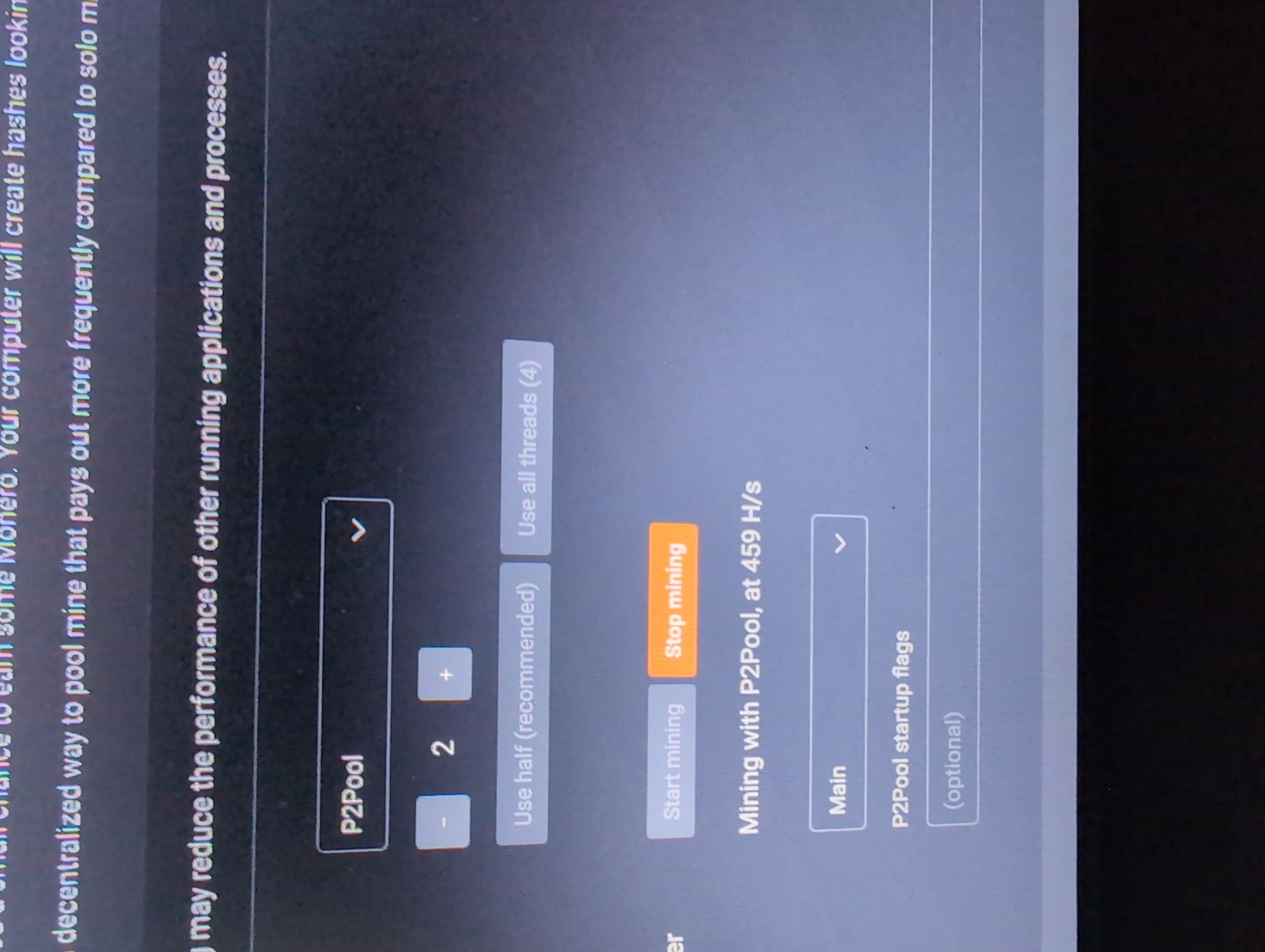 >>61347567Very niceBut>459 h/s>mainSwitch to P2Pool - nano.Better yet, use Gupaxx.https://youtu.be/8_MOQHYRE1chttps://github.com/Cyrix126/gupaxx