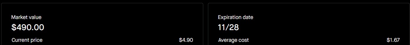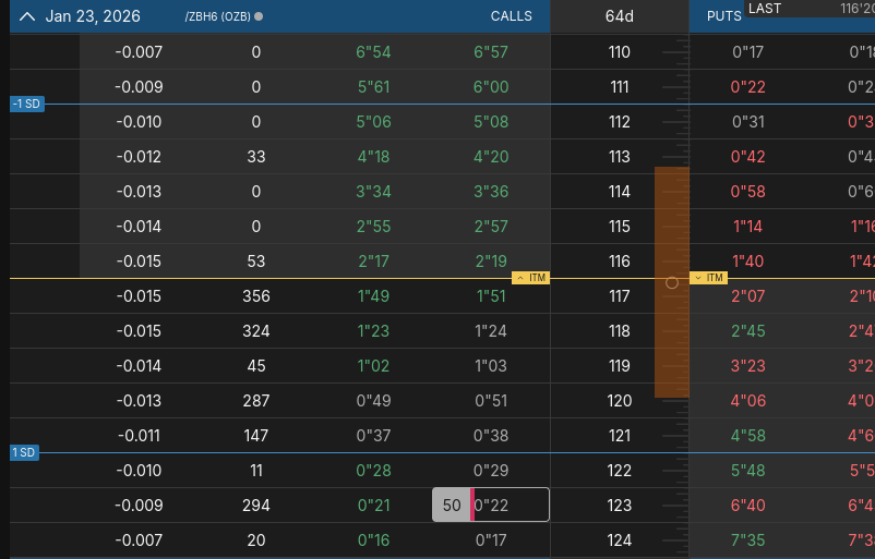 >>61361667aight, 50 contracts @ 22/64 /ZB expiring 1/23/26 which takes up about half my dry powder in that acct