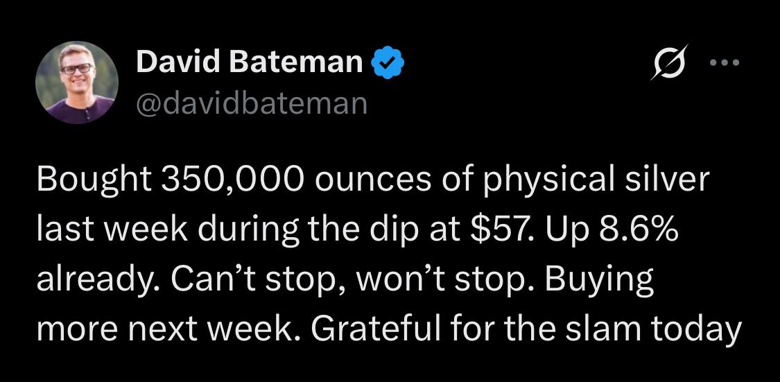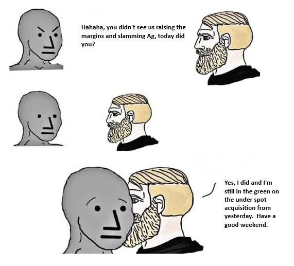 >>61483049CME Group rose the margin limits on silver from 5 to 10% at market open which essentially forced some of the weak hands into an automatic margin call and all CME group got out of it was a $2 dip.