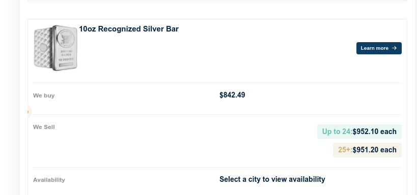 >>61501596I just look at the range numbers at the bottom.Cheapest dealer in Canada wants $952 for a 10 oz bar.