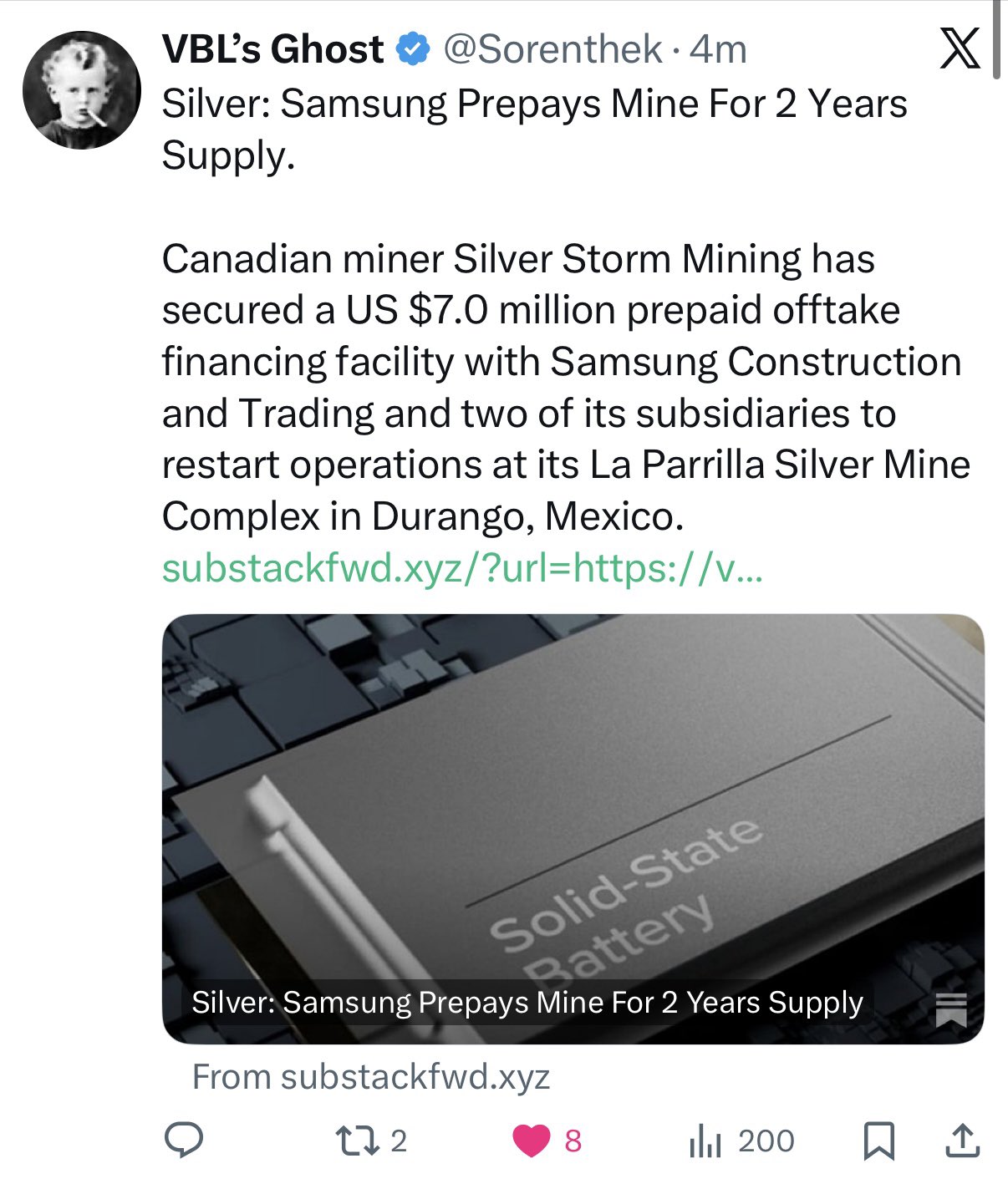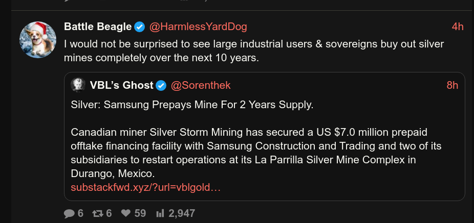 Imagine what the price of silver will be when many of the mines are bought up by industry to secure supply because COMEX/LBMA fucked up the market/price discovery so badly.We're looking at 10-20 years of highly restricted silver availability.https://x.com/HarmlessYardDog/status/2001400888422699052