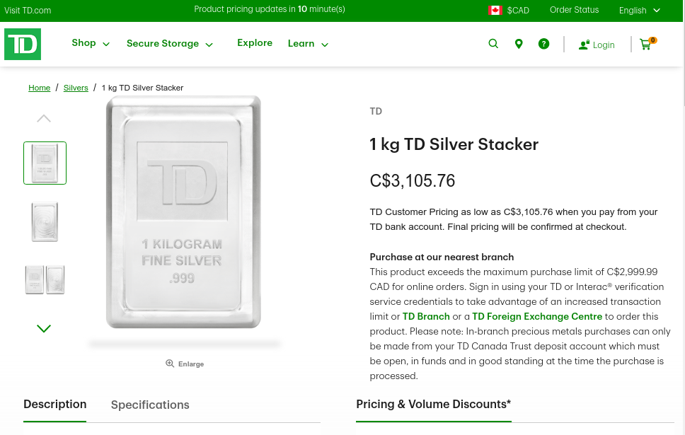 >>61507001>do they still make the td versions?I don't know if they are in production. They are probably made by Scottsdale mint and it would be a batch run of so many pieces. They appear to be still available, but they have a maximum limit of $2,999 for online sales, and 1kg of silver just crossed that threshold, so you would have to buy it in person at a TD bank. https://preciousmetals.td.com/shop/en/tdmetals/silvers/p0071