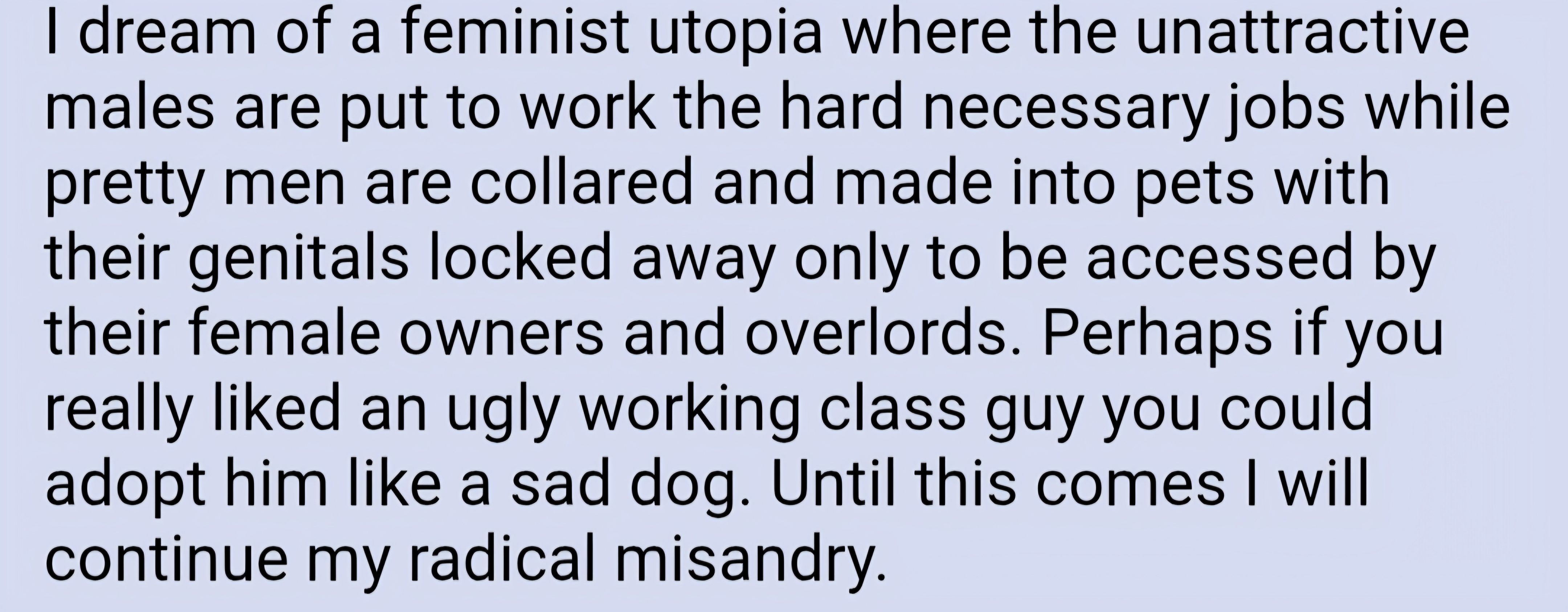 >>61518254>picrelI'd be ok with this IF the attractive males were allowed to worship a certain woman and support her completely in return for the woman's favor, a kind smile, and an "I'm proud of you" every now and then. Like basically traditional chivalry with aristocracy but in a matriarchy. This is surprisingly hard to achieve today because most women are not convincing enough actors.t. 30yo khhv
