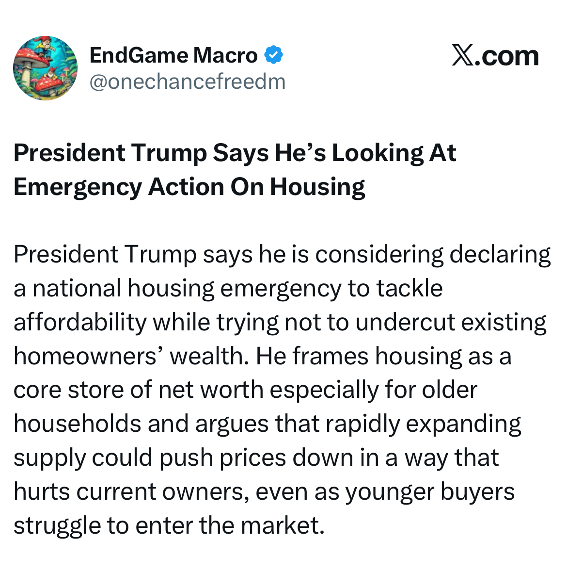 >while not undercutting existing homeowners wealthThat's the fucking problem.Trump is a retardfuck boomersRAISE RATES AND LET PRICES FALL