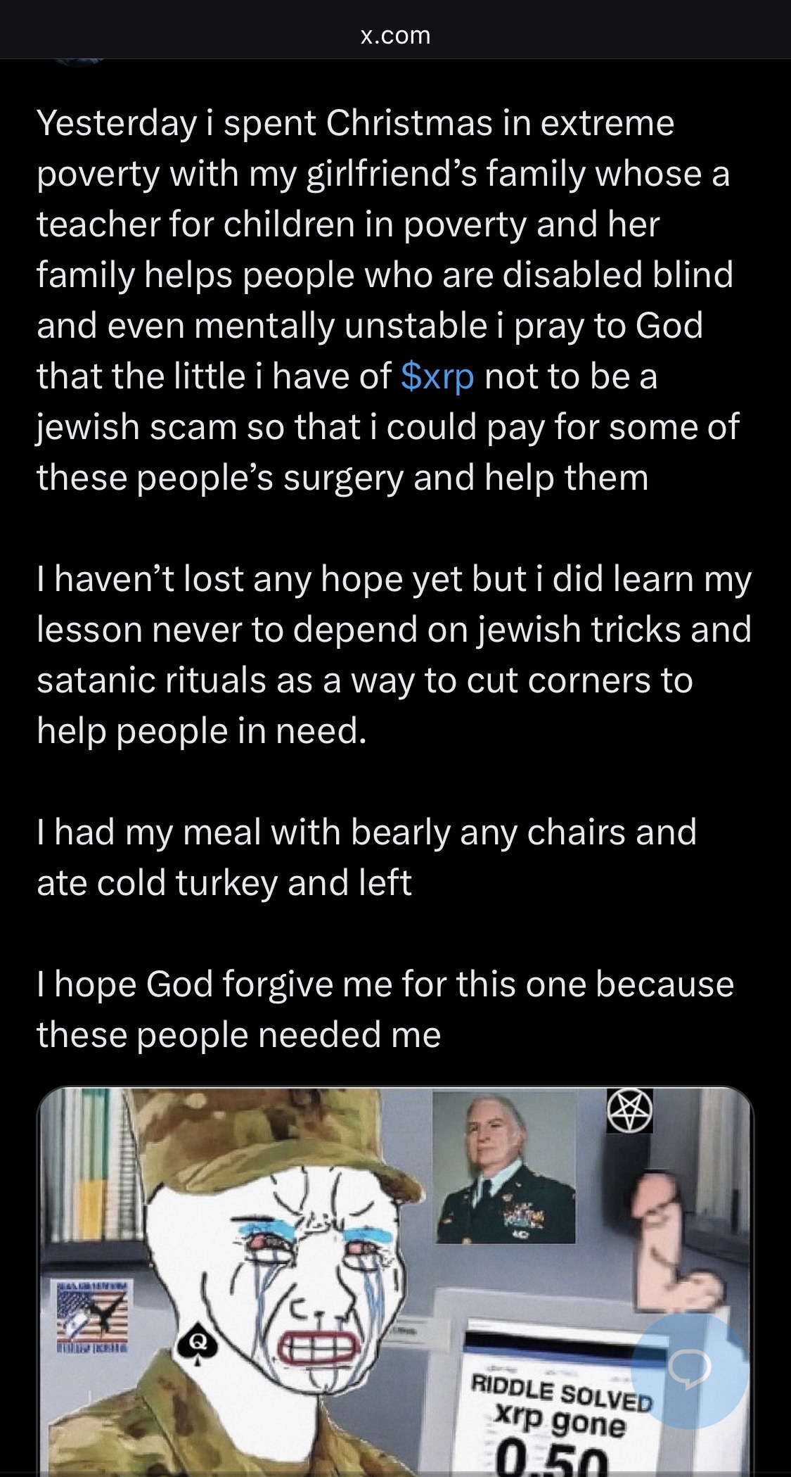 >>61535068The shape of BearableGuy123's mouth has remained exactly the same throughout every single picture, except for this one.In all of the previous drawing, his mouth curled up at both the left and right edges.Look at pic related; which is the image he posted from last year's Christmas.Now look at the mouth on this year's drawing that you posted.He has a bizarre looking mouth.No longer a smile; more like a grimace of pain.The theory has been that the mouth shape in all previous posts from BearableGuy123 were a preview of XRP's price action on the lifetime chart.But that original smile has been completed, so we get a new facial expression.If you look back at August 7th of this year, he posted on that day:https://x.com/bearableguy123/status/1953655267050029189?s=20>The bear smiles.Which was basically him telling us the smile was completed and done.Now we get a new facial expression, and new price action to go along with it.His mouth looks like a slowly descending sideways crab.A massive dump, represented by his right fang.And then a recovery back into the slowly descending crabbing.None of that price action, represented by his mouth shape, looks good.The drawing as a whole, is of BearableGuy123 and Brad Garlinghouse having successfully landed on the moon.But the shape of his mouth says the exact opposite.And maybe that's the hidden message of BearableGuy123.He's telling us to expect more painfully slow downward crabbing, a massive dump, and then a recovery back into downward crabbing.A final fuck you to all of us that have been bagholding XRP for years.He gets to string us along with more hope.And most people will miss the shape of his smile; or ignore it because they want hope.He might as well of posted a drawing of the bear taking a massive poop down a chimney.And piles of shit sitting under a Christmas tree.And lumps of coal in each stocking hanging from the fireplace.Merry Christmas I guess.