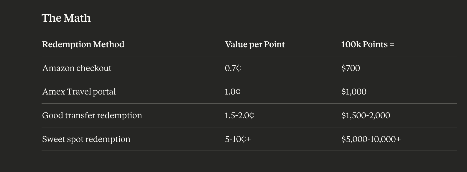 >>61549094>Spend the points on amazon. They add up.That's a turbo shitty way of redeeming Amex points. Jetblue/British Airways/Qatar/Virgin are generally going to give much better value. If you can't redeem at well over 1cpp there are better choices.