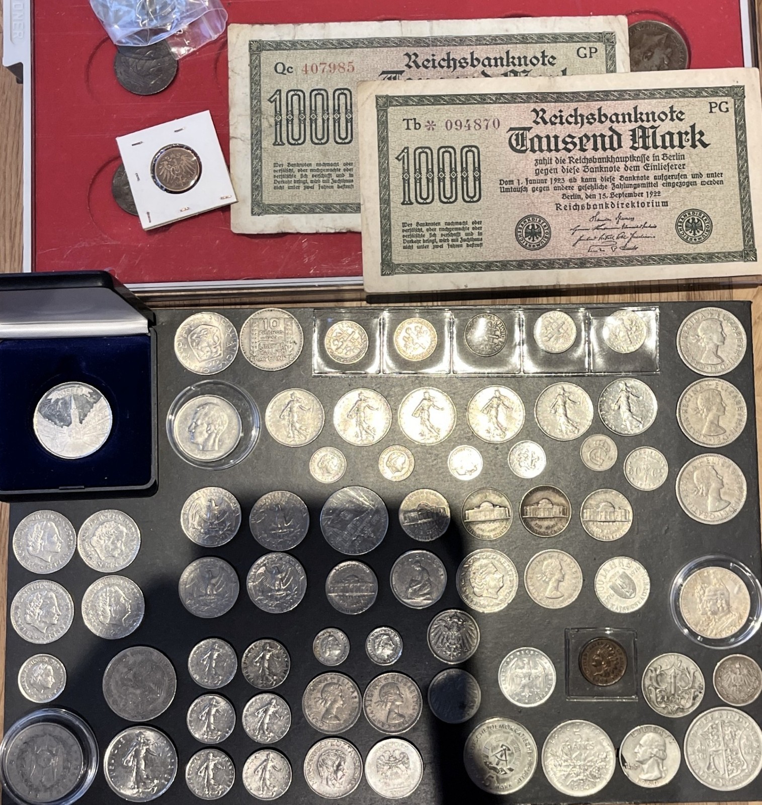 anyone care to take a look and help me out? Biddings are at 142€ currently but its tough to estimate with only some merc dimes and one visible date on a semeuse. dont wanna waste money on nickel desu.