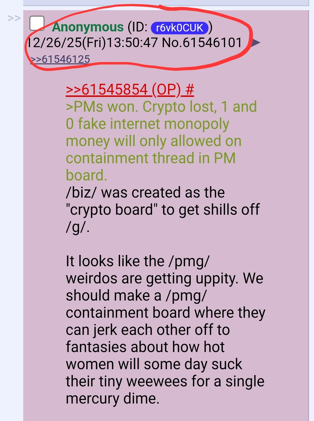 It looks like the /pmg/ weirdos are getting uppity. We should make a /pmg/ containment board where they can jerk each other off to fantasies about how hot women will some day suck their tiny weewees for a single mercury dime.